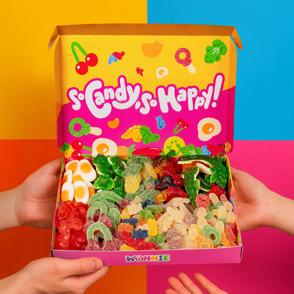 Plus de 30 bonbons parmi lesquels choisir, acidulés et non, XL et fourrés: déchaînez-vous et ajoutez Wunnie box au panier, le seul et unique ORIGINAL Candy box.