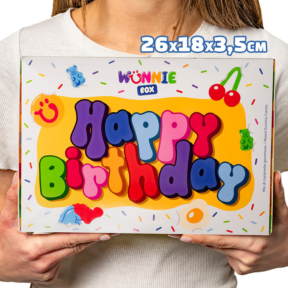 Tu cherches un cadeau d'anniversaire qui laisse une trace ou tu veux un gâteau alternatif? Voici pour toi Wunnie box “Happy Birthday” : une boîte super COLORÉE qui ressemble à un gâteau à l'extérieur, mais qui cache à l'intérieur 1 kg de bonbons gélifiés.