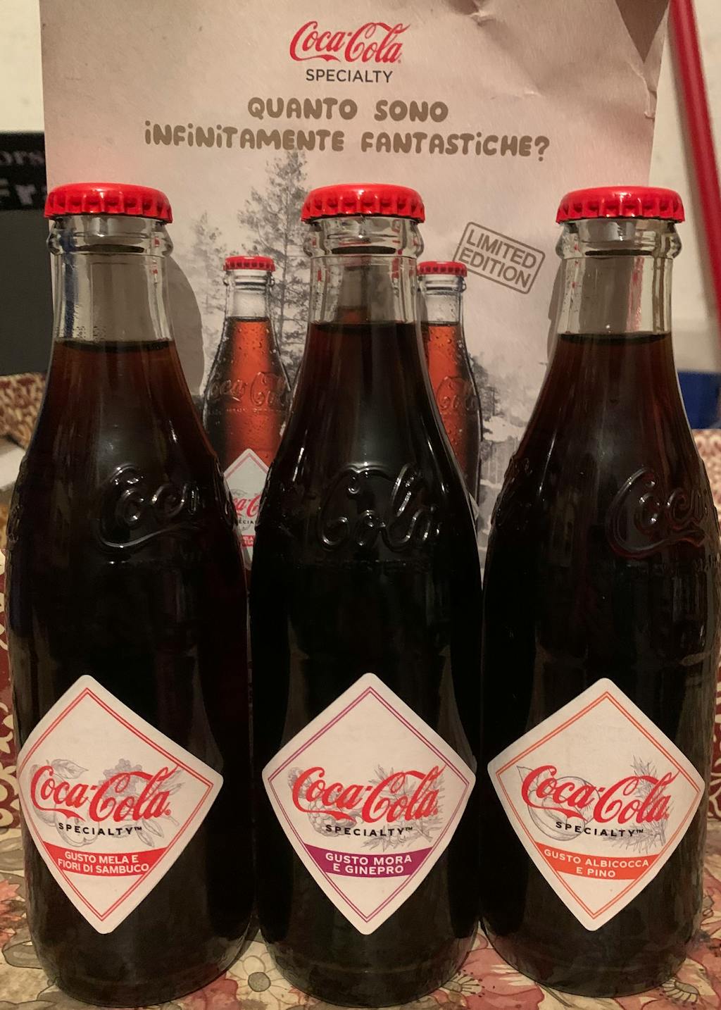3 Coca Cola Specialty (Abricot et Pin, Pomme et Sureau, Mûre et Genévrier), boisson en édition limitée de 250ml sur americanuncle.it