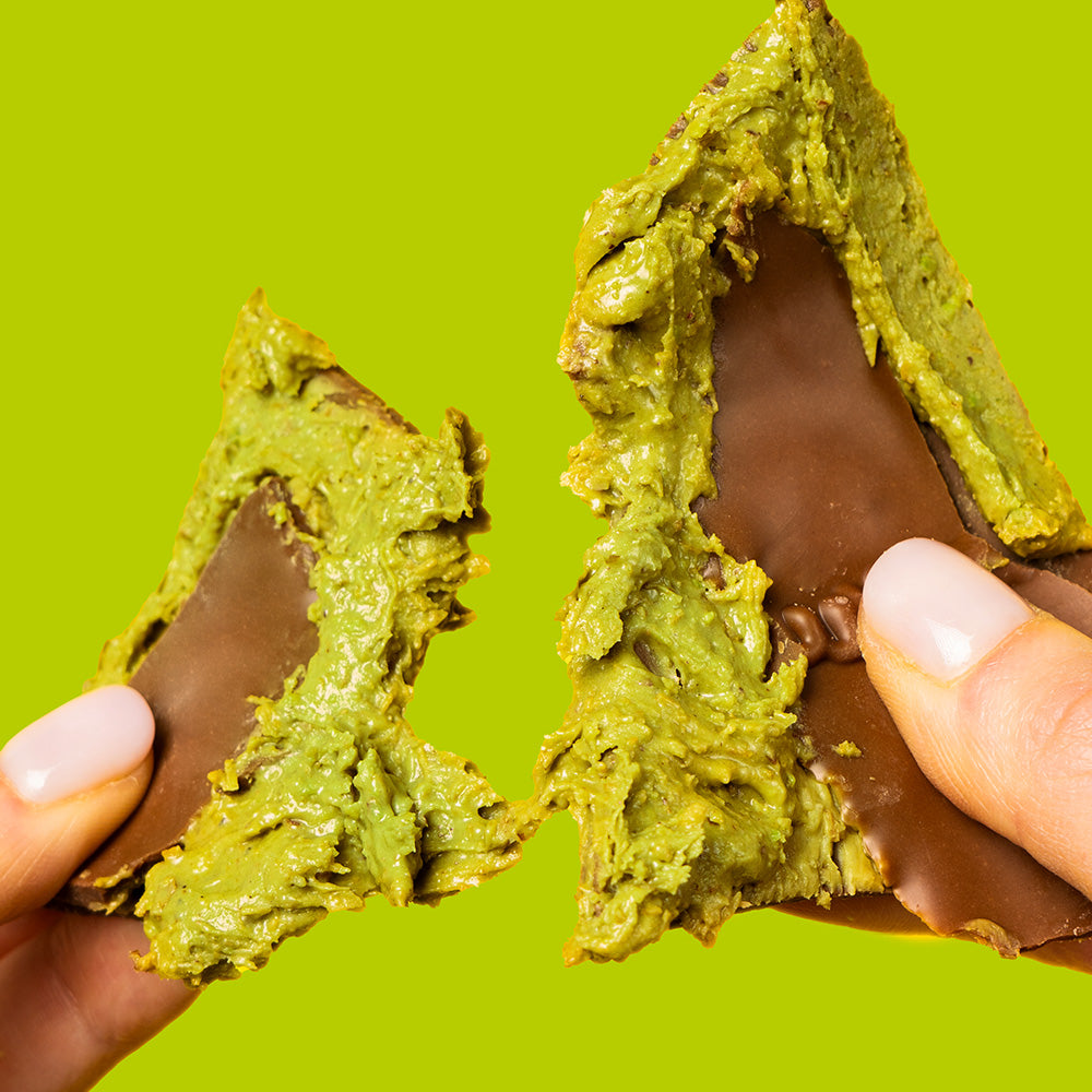 Œuf de chocolat au lait (cacao min. 33%) garni de crème pistache (20%) et de pâte Kataifi.